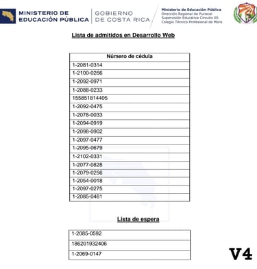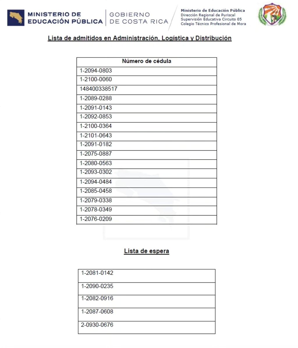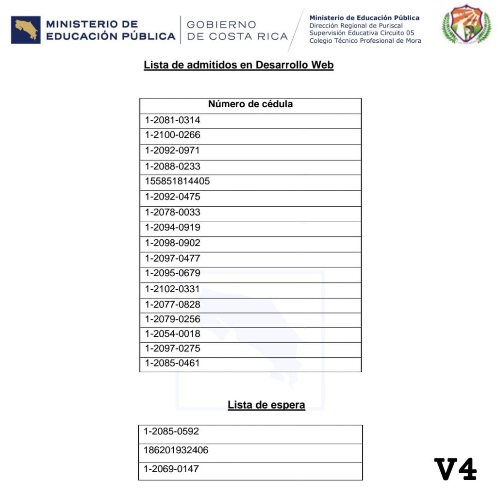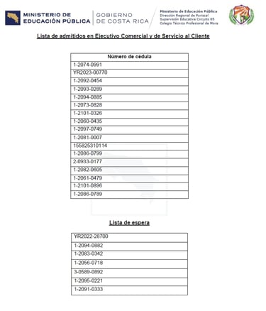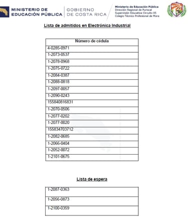 Les informamos la lista de estudiantes admitidos para el nivel de décimo curso lectivo 2026, según Especialidad Técnica. Muchas felicidades.